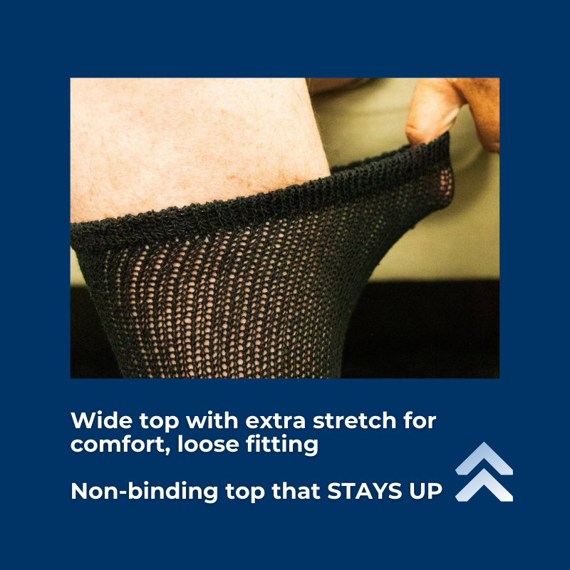 Wide top with extra stretch stays up without squeezing. Improves circulation for diabetic, edema, and neuropathy-prone feet.